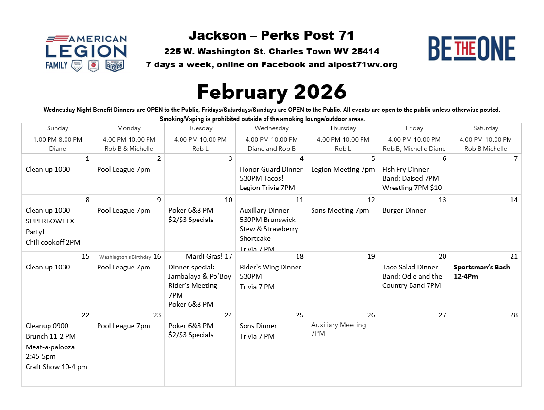 We are a Family Friendly, Non-Smoking Post. The public is invited Friday, and Saturday and during special events.